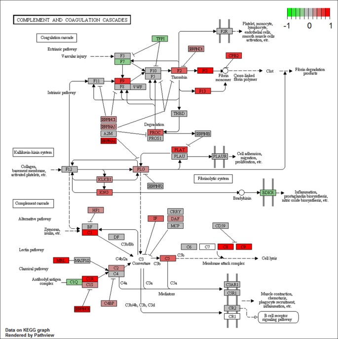 (补体与凝血 cascade通路图:红色标注为R6/2中上调的核心基因)