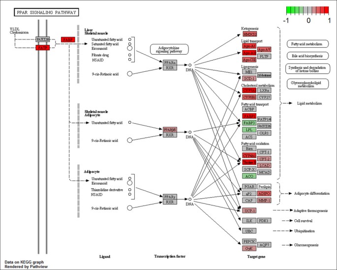 (PPAR信号通路图:红色标注为R6/2中上调的核心基因)