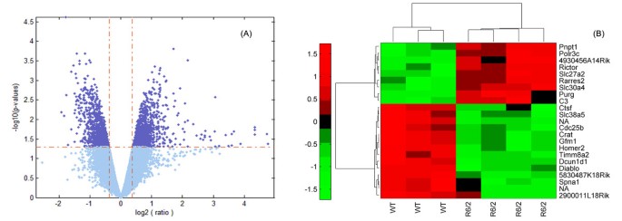 方法细节:从合格血液样本中提取总RNA,取500ng RNA制备扩增RNA(aRNA),杂交至Affymetrix Mouse Genome 430 2.0芯片(覆盖>34000个小鼠基因)。芯片数据通过R软件(Bioconductor包)处理:用RMA包进行分位数归一化,median-Polish算法总结探针集信号;用LIMMA包分析差异表达(筛选标准:p<0.05,绝对折叠变化|FC|>1.3)。