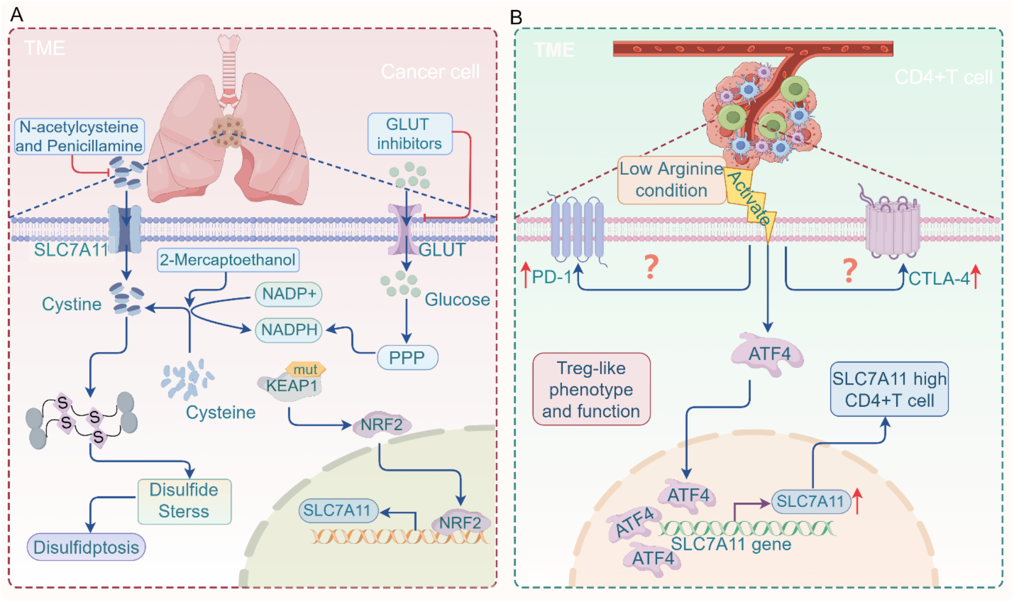 随后研究表明,SLC7A11高表达与肿瘤免疫逃逸密切相关:一方面,SLC7A11通过促进谷胱甘肽(GSH)合成抑制活性氧(ROS)介导的PD-L1表达;另一方面,SLC7A11高表达肿瘤细胞会诱导髓源性抑制细胞(MDSCs)浸润TME,抑制效应T细胞功能。然而,双硫死亡作为新型RCD,其相关通路如何调控免疫检查点分子表达、是否能与ICIs协同增强抗肿瘤疗效,目前尚未充分阐明。