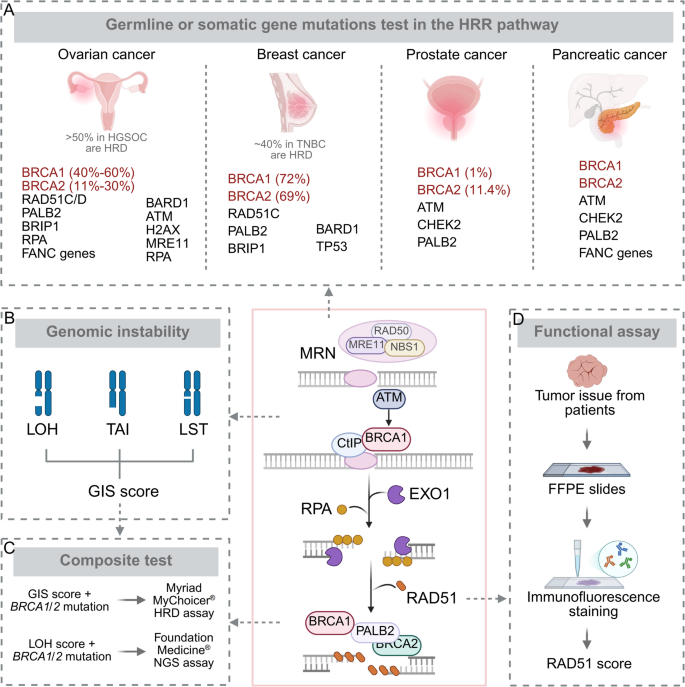 (Fig1:HRD的检测方法与遗传特征,包括基因变异、基因组瘢痕、功能检测及不同癌症的HR基因突变频率)