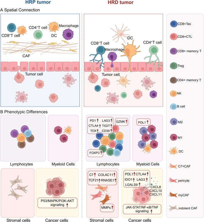 - 其他免疫细胞:HRD肿瘤中NK细胞(GZMH⁺)比例升高但表达LAG3/TIGIT(耗竭表型),M2型巨噬细胞(CD206⁺)比例较HR正常肿瘤高2倍,CAF高表达CXCL12/IL-6(促进肿瘤侵袭与免疫抑制)。