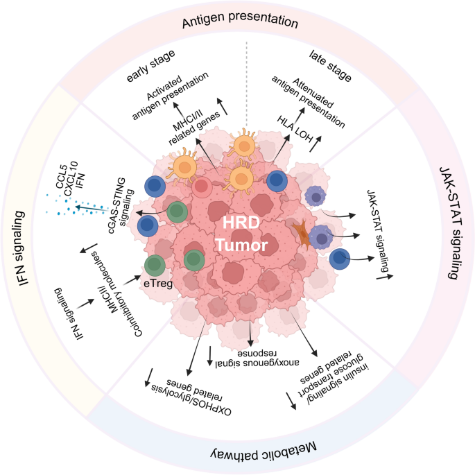 (Fig3:HRD癌症TME的分子机制,包括抗原呈递、IFN/JAK-STAT信号及代谢重编程)