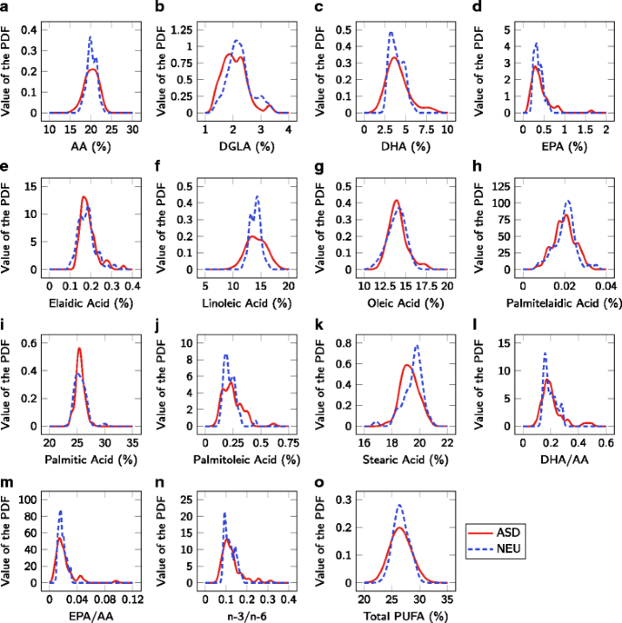 - 单变量统计:仅DGLA在ASD群体中显著降低(ASD均值1.2%,NEU均值1.3%,降低8%,p=0.03),但Bonferroni校正后p>0.05,无统计学意义;其他脂肪酸(如AA、DHA)的群体差异均不显著(p>0.05)。