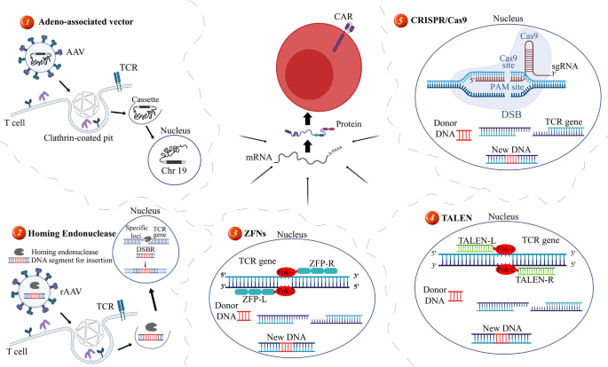 针对上述空白,本文系统综述了定点转基因整合技术在CAR-T/NK治疗中的应用,涵盖定点整合的方法(AAV、归巢内切酶、ZFN、TALEN、CRISPR/Cas9)、临床结果、优势与局限,以及基因组安全港(GSH)的选择标准,为CAR-T/NK的安全设计提供理论指导。