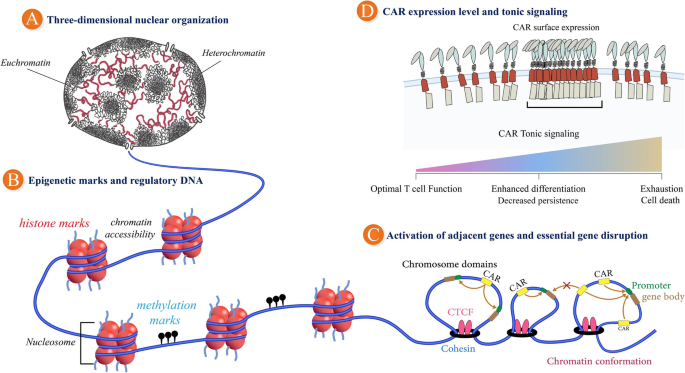 图3 GSH的选择原则:包括三维核组织(开放染色质区)、表观遗传标记(活性启动子)、邻近基因激活(远离癌基因)、CAR表达调控(避免tonic信号)等因素。