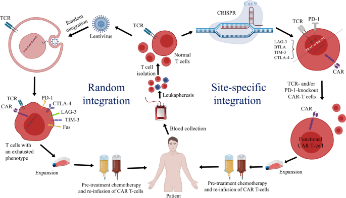 图1 随机整合与定点整合的CAR-T功能对比:随机整合导致tonic信号、T细胞耗竭;定点整合(如TRAC位点)通过内源性调控减少耗竭,提高疗效。