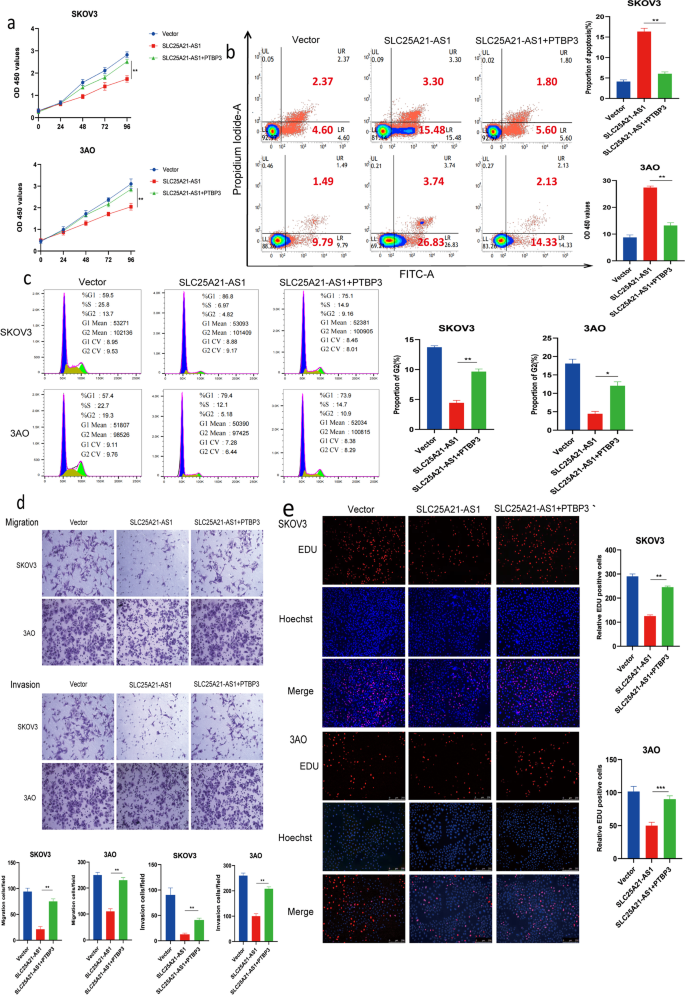 方法细节:在SKOV3、3AO细胞中稳定过表达SLC25A21-AS1,同时过表达PTBP3;采用CCK8、EdU、流式、Transwell实验检测功能变化。