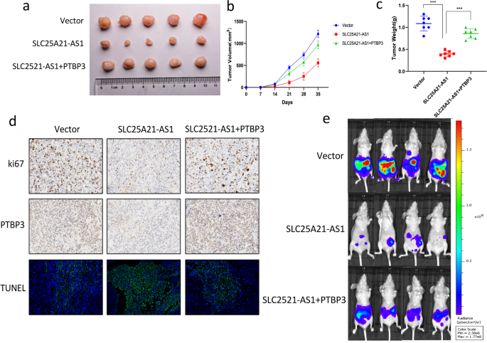 结果解读:过表达SLC25A21-AS1组肿瘤生长缓慢(体积小、重量轻,图7a-c),转移减少(生物发光信号弱,图7e);同时过表达PTBP3组肿瘤生长及转移恢复(图7a-e);免疫组化显示过表达SLC25A21-AS1组Ki67(增殖标志物)表达低、TUNEL(凋亡标志物)表达高,PTBP3组相反(图7d)。