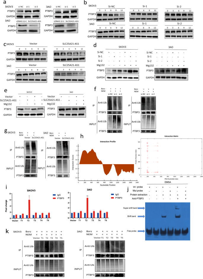 结果解读:敲低SLC25A21-AS1增加PTBP3蛋白水平,过表达则减少(图5a),但不影响PTBP3 mRNA水平;CHX实验显示过表达SLC25A21-AS1缩短PTBP3半衰期(图5b、c);MG132处理后PTBP3蛋白稳定性恢复(图5d、e);泛素化实验显示过表达SLC25A21-AS1增加PTBP3泛素化水平(图5f、g);T2截断体(180-256bp)与PTBP3结合最强,且其泛素化水平最高(图5i、k)。