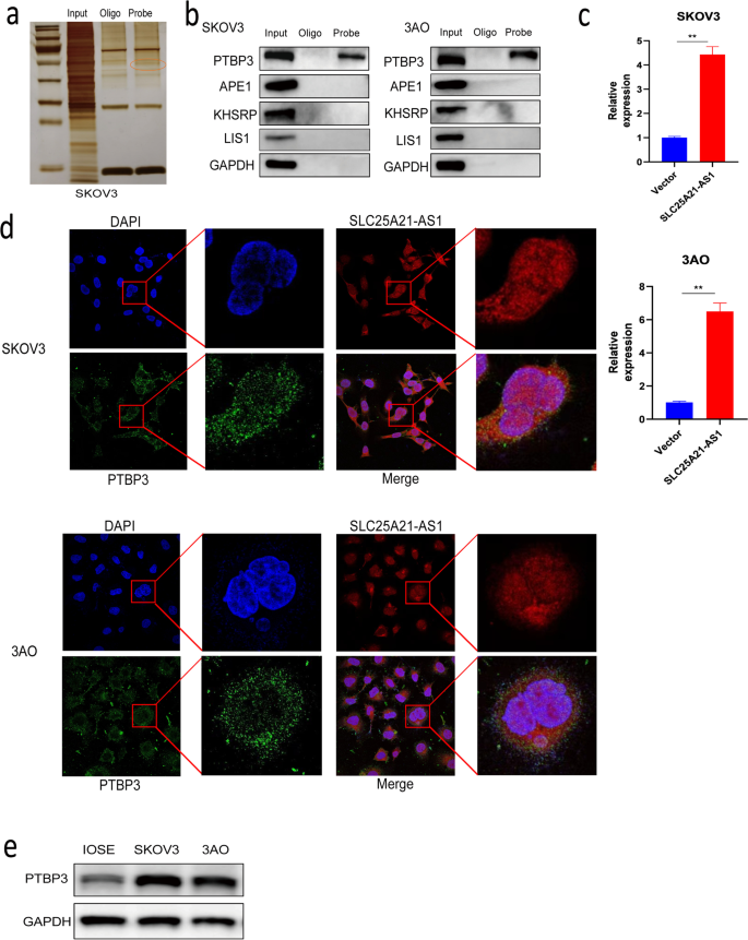 结果解读:质谱筛选到PTBP3为SLC25A21-AS1的结合蛋白(图3a、b);RIP实验显示过表达SLC25A21-AS1后PTBP3富集增加(图3c);IF-FISH共定位证实两者共定位于细胞质(图3d);EMSA显示T2段突变后结合消失(图5j)。