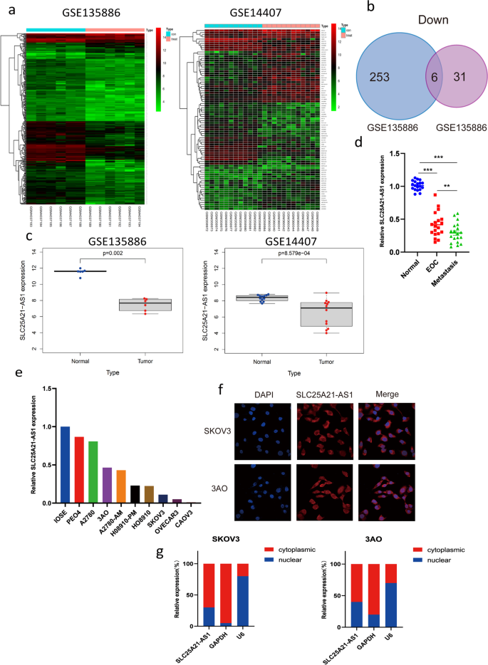 方法细节:通过R软件(Limma包)分析GSE135886(6例正常卵巢组织、6例EOC组织)和GSE14407(12例正常卵巢组织、12例EOC组织)数据库的差异基因,设置FDR<0.05、|log2(fold change)|>1为阈值,Venn图筛选共同下调的lncRNA;采用qPCR验证20对EOC组织/正常卵巢组织、9种EOC细胞系(如SKOV3、3AO)及正常卵巢上皮细胞系IOSE-80的SLC25A21-AS1表达。
