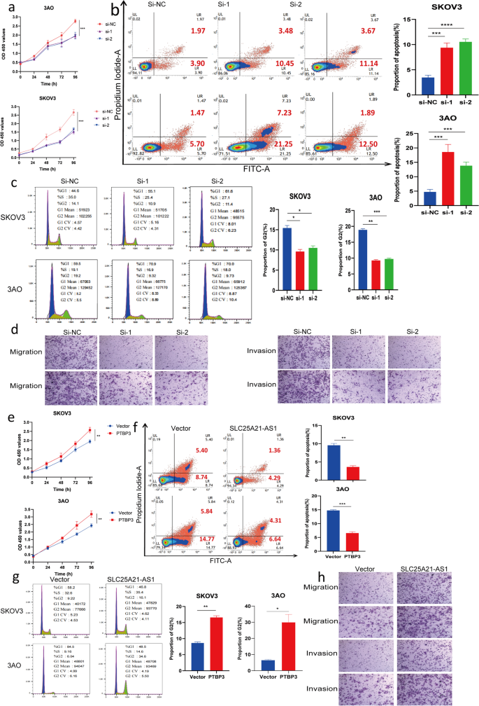 结果解读:敲低SLC25A21-AS1促进EOC细胞增殖(CCK8显示96小时增殖增加,图2a)、抑制凋亡(早期凋亡细胞减少,图2b)、增加G2期细胞比例(图2c)、促进迁移侵袭(图2d);过表达SLC25A21-AS1则抑制增殖(图2e)、促进凋亡(图2f)、减少G2期细胞(图2g)、抑制迁移侵袭(图2h)。