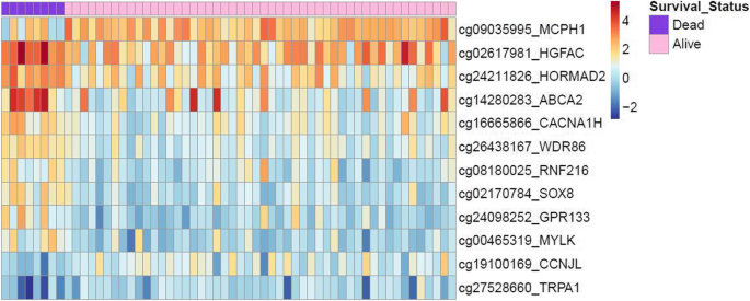 结果解读:共筛选出12个差异甲基化基因(ABCA2、CACNA1H、CCNJL、GPR133、HGFAC、HORMAD2、MCPH1、MYLK、RNF216、SOX8、TRPA1、WDR86)。热图显示(图2),死亡患者的甲基化特征与存活患者显著区分(死亡患者聚类于左侧,甲基化水平更高)。