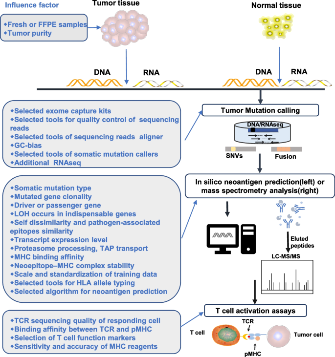 - 实验验证:质谱(MS)分析肿瘤组织HLA结合肽(直接检测表达的新抗原)、T细胞功能检测(IFN-γ ELISPOT、MHC四聚体,验证免疫原性),但质谱存在假阴性(低丰度肽无法检测),T细胞检测低通量(仅能检测少数肽)。