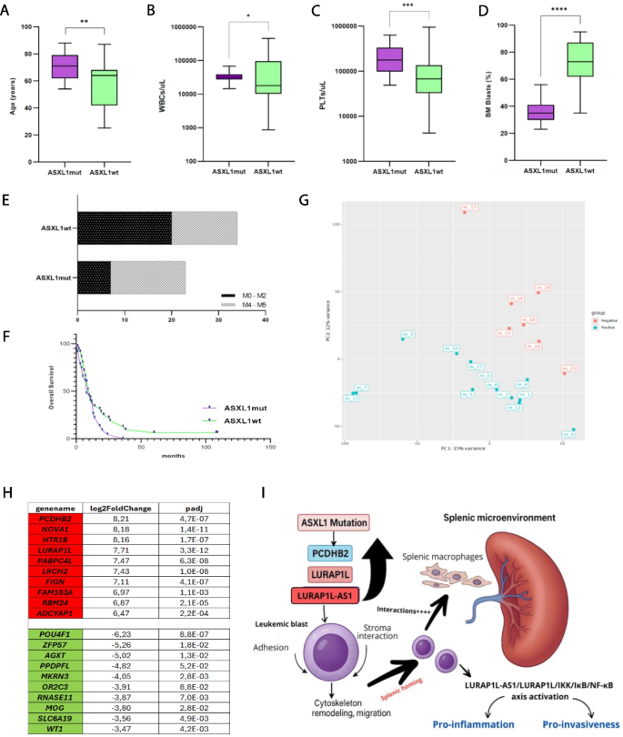 结果解读:PCA结果显示两组样本的基因表达谱存在明显分离(图2G);DEGs分析显示,PCDHB2基因在ASXL1突变组中上调最显著(Log2FC=8.211,p-adjusted=4.74e-07),LURAP1L(长链非编码RNA LURAP1L-AS1的宿主基因)和LURAP1L-AS1也显著上调(分别为7.71倍和7.97倍)(图2H)。这些基因均参与细胞黏附、迁移及细胞-基质相互作用,推测可能与ASXL1突变白血病细胞向脾脏浸润有关。