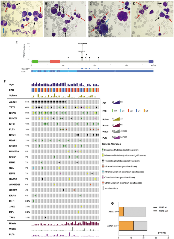 结果解读:ASXL1是本队列中最常见的突变基因(23/58,40%),突变类型以截断突变为主(20例移码插入/缺失、3例无义突变),主要影响外显子12和13,可导致ASXL1蛋白C端PHD结构域缺失,增强BAP1去泛素化酶活性(图1E)。共突变分析显示,ASXL1突变患者中NRAS突变频率显著高于ASXL1野生型患者(52% vs 18%,p=0.028),提示两者可能存在协同致白血病作用(图1F-G)。