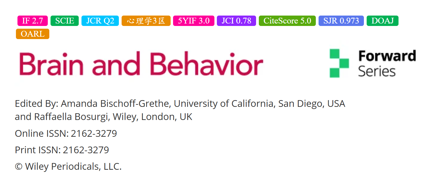 《Brain and Behavior》由Wiley-Blackwell主办,创刊于2011年,核心定位为神经科学与行为科学交叉领域的中高端开放获取期刊。其收稿特色在于:优先录用融合行为学数据+分子/细胞机制的原创研究,覆盖动物模型(小鼠、果蝇等)与人类临床研究(如认知行为测试);同时接收高质量综述(需编辑部邀请或提前申请)。该期刊2024年发文量为1200篇,非Mega Journal,适合中早期科研人员积累高质量成果。