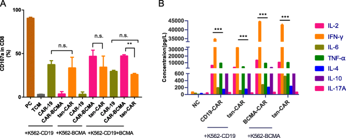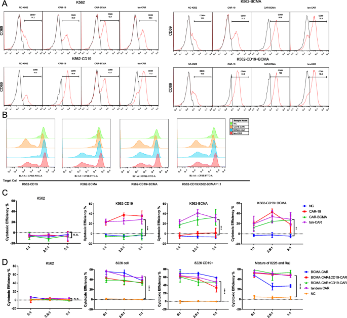 - 特异性数据:tan-CAR T细胞仅对CD19和/或BCMA阳性细胞有显著杀伤(如对野生型K562细胞的杀伤率<10%),对靶点阴性细胞无明显反应;