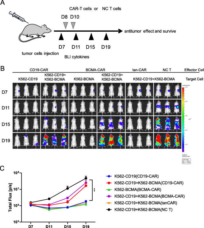 实验目的是验证tan-CAR T细胞能否被CD19和/或BCMA阳性肿瘤细胞激活并增殖。方法细节:构建K562-CD19、K562-BCMA、K562-CD19+BCMA稳定细胞系(过表达对应抗原及荧光素酶);将tan-CAR T细胞与上述靶细胞共培养24小时,通过流式细胞术检测CD69(T细胞激活标志物)的表达;用CFSE标记CAR T细胞,与丝裂霉素处理的靶细胞共培养5天(E:T=1:1),通过CFSE稀释程度评估增殖能力。结果解读:tan-CAR T细胞与K562-CD19、K562-BCMA或K562-CD19+BCMA共培养后,CD69阳性率分别为45%、42%、51%,与单靶点CAR-T(CD19-CAR T为48%、BCMA-CAR T为44%)相当,显著高于未转导T细胞(NC,<10%);CFSE稀释实验显示,tan-CAR T细胞的增殖指数为6.2(K562-CD19+BCMA组),与单靶点CAR-T(CD19-CAR T为5.8、BCMA-CAR T为5.5)相似,显著高于NC(1.2,n=3,P<0.01)。实验所用关键产品:CFSE试剂盒(Abcam)、CD69-PE抗体(Biolegend)、流式细胞仪(Attune NxT,Thermo Fisher)。