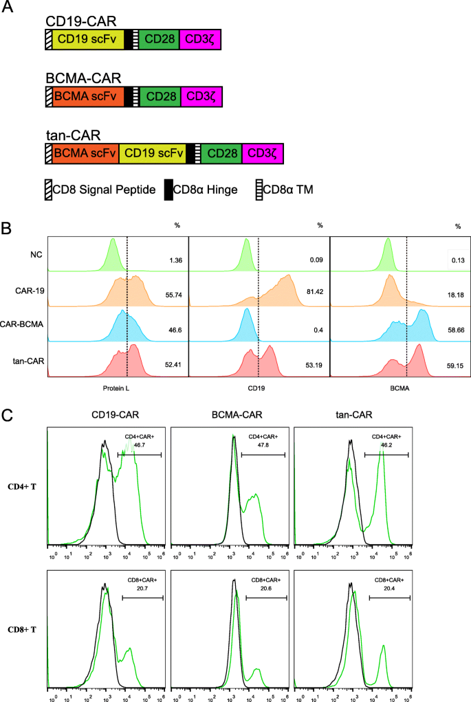 实验目的是构建CD19/BCMA双串联CAR(tan-CAR)及单靶点对照CAR(CD19-CAR、BCMA-CAR),并验证其在原代T细胞中的表达。方法细节:tan-CAR载体由CD8信号肽、抗BCMA scFv(C11D5.3)、抗CD19 scFv(FMC63)、CD8α铰链/跨膜区、CD28共刺激域及CD3ζ信号域串联组成;单靶点CAR载体仅包含对应抗原的scFv,其他结构与tan-CAR一致。通过慢病毒转导激活后的原代CD3+ T细胞(激活方法:抗CD3/CD28单抗刺激18~24小时),转导后培养14天(含重组人IL-2、IL-7、IL-15)。结果解读:流式细胞术显示,tan-CAR、CD19-CAR、BCMA-CAR的转导效率分别为52%、48%、55%(通过L蛋白-FITC检测scFv表达);tan-CAR T细胞同时表达BCMA-scFv(59%阳性)和CD19-scFv(53%阳性),表达水平与单靶点CAR-T相似;CD4/CD8 T细胞比例约为1:1,与单靶点CAR-T无显著差异(n=3)。实验所用关键产品:慢病毒载体(pUT质粒,Unicar-Therapy)、CD3+ T细胞富集磁珠(Miltenyi Biotec)、重组人IL-2(Peprotech)、重组人IL-7(Peprotech)、重组人IL-15(Peprotech)。