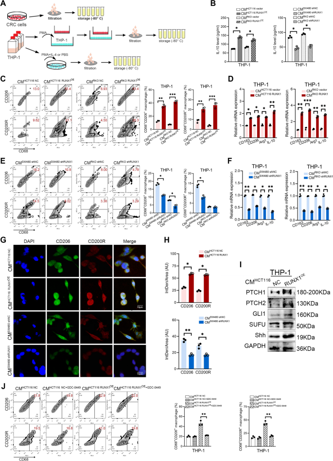 实验目的是验证RUNX1是否通过分泌CCL2招募TAMs并诱导其向M2型极化。方法上,构建RUNX1过表达(HCT116、RKO)和敲低(SW480、RKO)CRC细胞系,收集条件培养基(CMs)处理THP-1细胞(经PMA诱导为M0型巨噬细胞);通过ELISA检测CMs中CCL2水平,ChIP-qPCR和双荧光素酶报告实验验证RUNX1对CCL2启动子的结合与调控;Flow cytometry检测THP-1细胞M2型标记物(CD68+CD206+、CD68+CD200R+)的表达,qRT-PCR检测M2相关基因(CD163、CD206、Arg1、IL-10)的mRNA水平,Western blotting检测Hedgehog通路分子(PTCH1、GLI1、Shh)的表达,并用Hedgehog通路抑制剂GDC-0449进行rescue实验。结果显示,RUNX1过表达显著增加CCL2的mRNA和蛋白水平(P<0.05),且RUNX1可直接结合CCL2启动子的ACAGGAT区域(ChIP-qPCR验证);RUNX1过表达CMs处理后,THP-1细胞中M2型标记物及相关基因表达显著升高(P<0.05),Hedgehog通路分子表达激活,而GDC-0449处理可显著降低M2型细胞比例(P<0.01);RUNX1敲低则呈现相反结果。实验所用关键产品:PMA(分化THP-1)、GDC-0449(Hedgehog抑制剂)、CCL2抗体(Proteintech,25542-1-AP)。