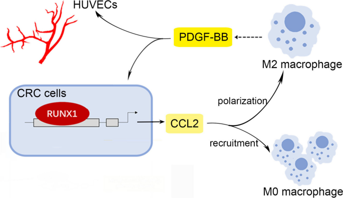 现有研究的局限性在于,缺乏RUNX1对CRC血管生成的具体机制探讨,以及RUNX1与TAMs相互作用在血管生成中的角色解析。本研究的创新价值在于,首次揭示了RUNX1通过促进趋化因子CCL2分泌和Hedgehog通路激活,招募并诱导TAMs向M2型极化,进而通过M2型TAMs分泌的血小板衍生生长因子BB(PDGF-BB)促进肿瘤血管生成,同时PDGF-BB可反式激活RUNX1表达,形成正反馈环路,这一发现填补了RUNX1在CRC血管生成中作用的空白,为CRC的联合靶向治疗提供了新的思路。