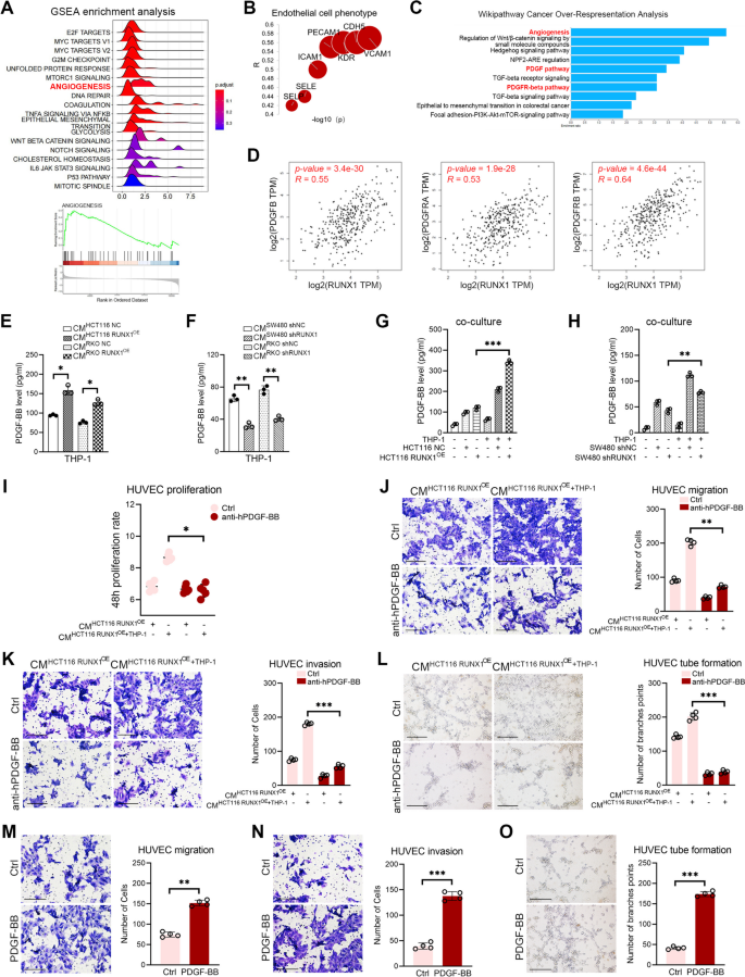 实验目的是探究RUNX1-TAMs串扰对CRC血管生成的作用。方法上,将RUNX1过表达/敲低CRC细胞与THP-1细胞共培养,收集共培养CMs处理人脐静脉内皮细胞(HUVEC),进行细胞增殖(CCK-8)、迁移(Transwell)、侵袭(Transwell)及管形成(Matrigel)实验;通过鸡胚绒毛尿囊膜(CAM)实验、裸鼠Matrigel plug实验及原位瘤模型,检测体内血管生成情况;用PDGF-BB中和抗体验证其在血管生成中的作用。结果显示,RUNX1过表达共培养CMs显著促进HUVEC的增殖(P<0.05)、迁移(P<0.01)、侵袭(P<0.001)及管形成(P<0.001),而PDGF-BB中和抗体可逆转这些效应;体内实验中,RUNX1过表达组CAM血管面积比例(P<0.01)、Matrigel plug血管数目(P<0.001)及原位瘤血管密度(P<0.01)均显著高于对照组。实验所用关键产品:Matrigel(Corning,354248)、HUVEC细胞、PDGF-BB中和抗体。