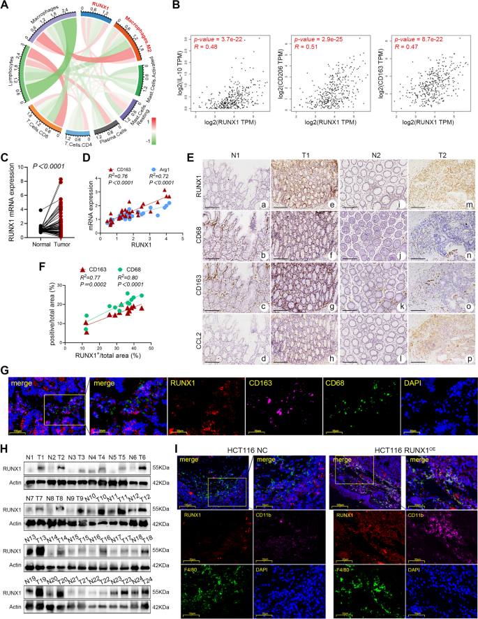 实验目的是通过生物信息学和临床样本分析,明确RUNX1与TAMs浸润、血管生成的相关性。方法上,利用TCGA、GEPIA、TIMER等数据库分析RUNX1与免疫细胞标记物(如CD163、CD206、IL-10)、血管生成相关基因(如SELE、CDH5、KDR)的表达关联;收集66对CRC临床样本进行qRT-PCR检测RUNX1 mRNA表达,24对样本进行Western blotting验证,12对样本进行免疫组化(IHC)分析RUNX1与TAMs标记物(CD68、CD163)、血管生成标记物(CD31)的相关性;通过多重免疫荧光(IF)染色验证RUNX1在肿瘤组织中的细胞定位。结果显示,RUNX1在CRC肿瘤组织中mRNA和蛋白水平均显著高表达(n=66,P<0.0001;n=24,20/24样本高表达);数据库分析及临床样本验证表明,RUNX1表达与M2型TAMs标记物(CD163、CD206、IL-10)呈正相关(P<0.05),与血管生成标记物(CD31)也呈正相关(P<0.05);多重IF染色显示RUNX1高表达位于肿瘤细胞而非巨噬细胞。实验所用关键产品:RUNX1抗体(Proteintech,25315-1-AP)、CD163抗体(ZSGB-BIO,ZM-0428)、CD31抗体(Proteintech,28083-1-AP)。