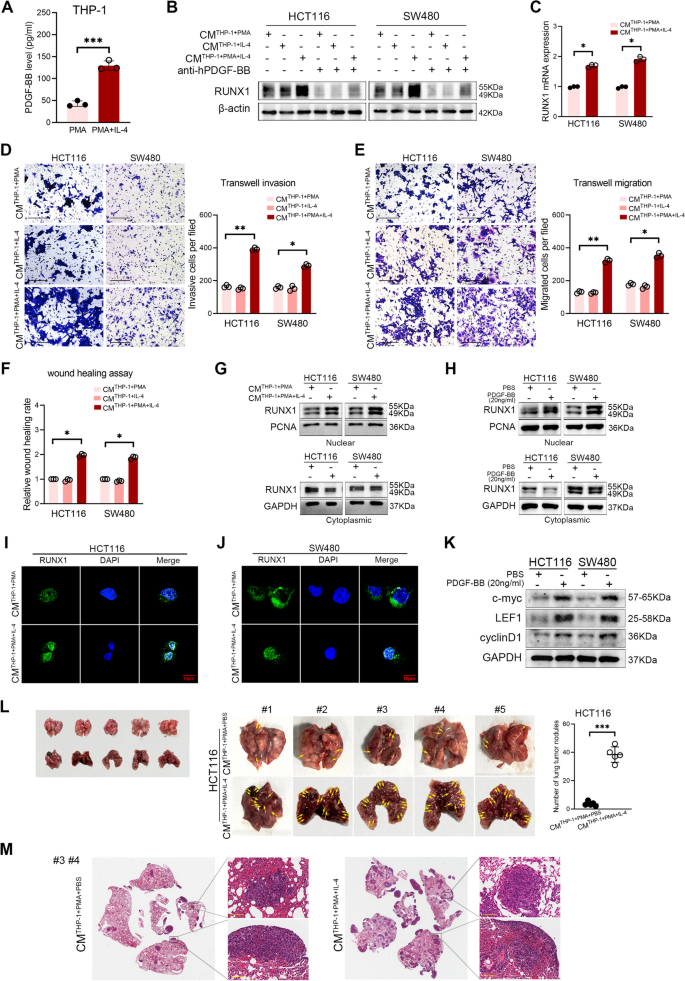 实验目的是验证PDGF-BB对RUNX1的反馈调控及对CRC恶性行为的影响。方法上,用IL-4诱导THP-1细胞为M2型,收集CMs处理CRC细胞(HCT116、SW480),或用外源性PDGF-BB处理,通过WB、qRT-PCR检测RUNX1的mRNA和蛋白水平;进行迁移(Transwell)、侵袭(Transwell)及伤口愈合实验验证CRC细胞恶性行为;通过Western blotting检测RUNX1在细胞质和细胞核中的分布,以及Wnt/β-catenin通路分子(c-myc、LEF1、cyclinD1)的表达;构建裸鼠肺转移模型,验证PDGF-BB对CRC转移的影响。结果显示,M2型TAMs CMs或外源性PDGF-BB可显著增加RUNX1的mRNA和蛋白水平(P<0.05),并促进其核转位;PDGF-BB处理显著增强CRC细胞的迁移、侵袭及伤口愈合能力(P<0.05),同时激活Wnt/β-catenin通路;肺转移模型显示,M2型CMs处理的CRC细胞肺转移结节数目显著增加(n=5,P<0.001)。实验所用关键产品:IL-4(诱导M2极化)、PDGF-BB蛋白、Wnt通路分子抗体(c-myc、LEF1、cyclinD1)。