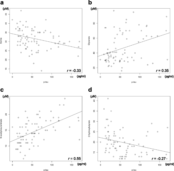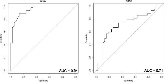 实验目的是探索核心代谢物与现有AD生物标志物(p-tau、Aβ42)的关联,评估其临床价值。方法细节:用酶联免疫吸附试验(ELISA)检测CSF中p-tau(INNOTEST PHOSPHO-TAU(181P)试剂盒)和Aβ42(INNOTEST β-AMYLOID(1-42)试剂盒)的浓度;用Pearson相关分析核心代谢物与p-tau、Aβ42的相关性;用ROC曲线分析p-tau、Aβ42的鉴别性能,与核心代谢物组合比较。结果解读:核心代谢物与p-tau呈弱至中度相关(丝氨酸r=-0.33,甘油酸r=0.35,Neu5Ac r=0.55,2-HB r=-0.27)(图3);与Aβ42的相关性较弱或无(丝氨酸r=0.10,甘油酸r=-0.35,Neu5Ac r=0.18,2-HB r=0.01)(图4)。ROC分析显示,p-tau的AUC=0.94(灵敏度、特异性未明确),Aβ42的AUC=0.71(图5),核心代谢物组合的鉴别能力(AUC=0.90)与p-tau相当。产品关联:实验所用关键产品:Fujibireo Inc.的INNOTEST β-AMYLOID(1-42)试剂盒、INNOTEST PHOSPHO-TAU(181P)试剂盒。