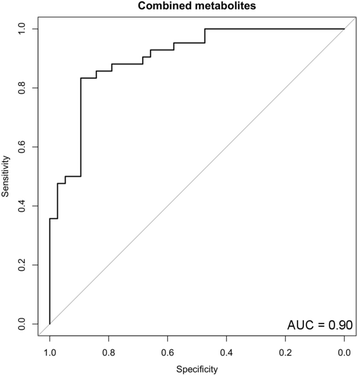 研究过程详述:标志物来源为AD与iNPH患者的CSF样本(腰椎穿刺收集,-80℃冻存);验证方法包括CE-TOFMS定量代谢物浓度(重复检测确保准确性)、ELISA检测现有生物标志物(p-tau、Aβ42)浓度;特异性与敏感性数据:4种代谢物组合的AUC=0.90(95%置信区间未明确),灵敏度0.86,特异性0.84(样本量未明确,基于验证集结果)。