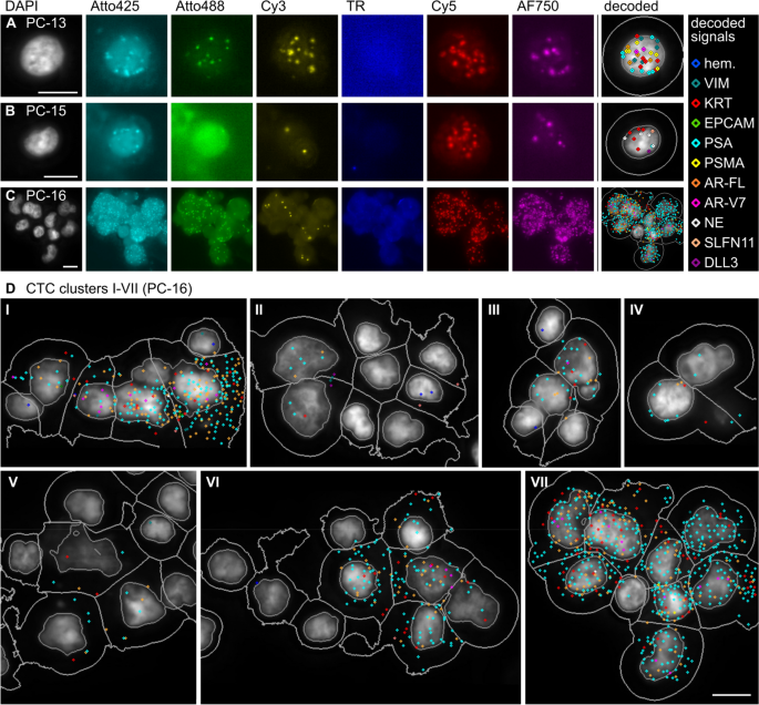 方法细节:基于padlock探针技术,设计组合双色(CoDuCo)编码策略——每个标志物对应两个荧光通道的组合(如Cy3+TexasRed对应造血标志物,Atto425+Cy5对应角蛋白KRT标志物),利用7通道显微镜(DAPI+6信号通道)实现最多15个标志物检测(因Cy5与TexasRed串扰,实际应用11个)。每个基因设计最多44条反转录引物与20条padlock探针,通过bridge探针与荧光readout探针间接杂交解码信号。
