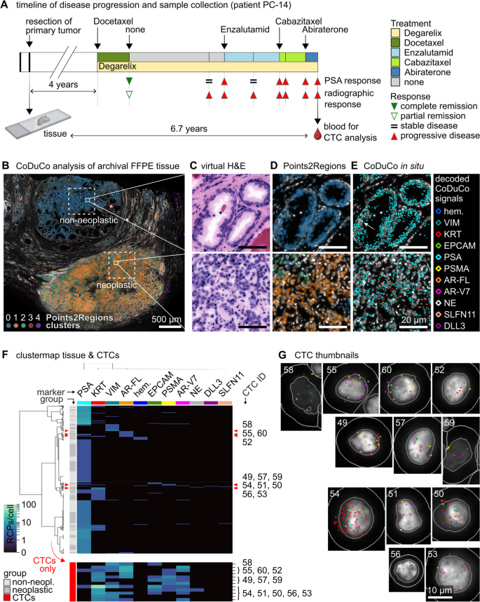 方法细节:收集3例前列腺癌患者的血液样本(富集CTCs)与1例患者的匹配FFPE肿瘤组织,进行CoDuCo assay;通过CellProfiler分析CTCs标志物表达,结合TissUUmaps分析肿瘤组织空间表达;关联临床参数(如PSA水平、神经内分泌标志物血清水平)。