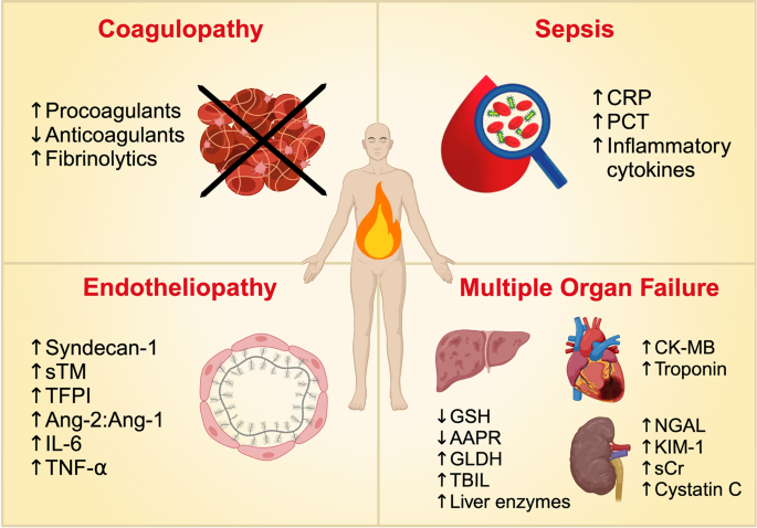 (图2:烧伤诱导内皮病、凝血病、多器官衰竭、败血症的生物标志物变化总结)