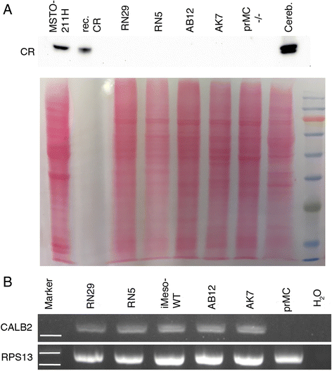 方法细节:① IHC:对NF2+/−小鼠MM组织、granuloma及人类ZL55细胞移植瘤(阳性对照)进行石蜡切片染色,使用SWANT的CR7696抗体(1:500),4℃过夜孵育,二抗为生物素化抗兔IgG(1:10000),ABC系统显色;② Western blot:提取小鼠间皮瘤细胞系(RN29、RN5、AK7、AB12)、人类MSTO-211H细胞(阳性对照)、小鼠小脑(阳性对照)及CR−/−小鼠原代间皮细胞(阴性对照)的蛋白(≥50μg),通过SDS-PAGE(10%凝胶)分离后转膜,用CR7696抗体(1:10000)检测,化学发光法显影;③ RT-qPCR:用PeqGold Trifast提取细胞系总RNA,Qiagen QuantiTect Reverse Transcription kit反转录为cDNA,用Calb2引物(FW: 5′-GAA ATG GGT ACA TTG AAG GTA-3′,RV: 5’-CCA TCT GAG TTC TTC TTA TCA TAC 5′)检测mRNA水平,以RPS13为内参。