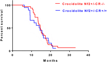 方法细节:选取C57Bl/6J背景的NF2+/−(n=18)和NF2+/−CR−/−(n=30)小鼠(6-8周龄),每3周腹腔注射400μg青石棉(总剂量3.2mg),对照组为未暴露的NF2+/−小鼠(n=5);观察小鼠肿瘤发生(病理确诊)及生存时间,最长随访33个月。