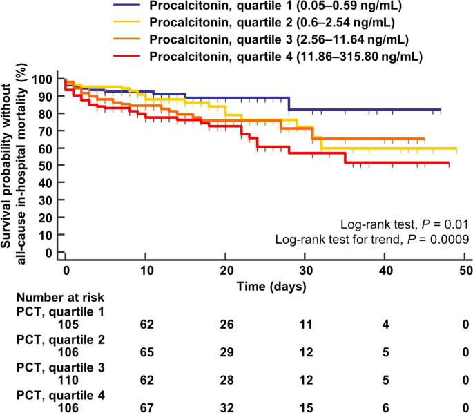实验目的是验证结果的稳健性。方法细节:将PCT分为4个四分位数(1st:0.05-0.59 ng/mL,2nd:0.60-2.55 ng/mL,3rd:2.56-11.64 ng/mL,4th:11.65-315.80 ng/mL),比较各四分位数的死亡率;用多变量logistic回归和Cox回归分析剂量反应关系。