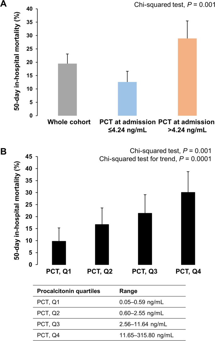 图1A显示,PCT>4.24 ng/mL的患者50天死亡率(28.9%)显著高于≤4.24 ng/mL的患者(12.6%);图1B显示PCT四分位数与死亡率的剂量反应关系。