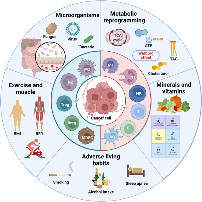 当前领域的研究热点集中于免疫生物标志物——即能客观反映肿瘤免疫状态的分子、细胞或功能指标,其不仅能预测免疫治疗的疗效和毒性,还能揭示肿瘤免疫逃逸的机制。然而,现有研究多聚焦于单一环节(如T细胞耗竭)或单一标志物(如PD-L1),缺乏对肿瘤免疫周期的系统整合,且代谢、微生物、运动等新兴因素对肿瘤免疫的调节及相关生物标志物尚未被充分阐明。