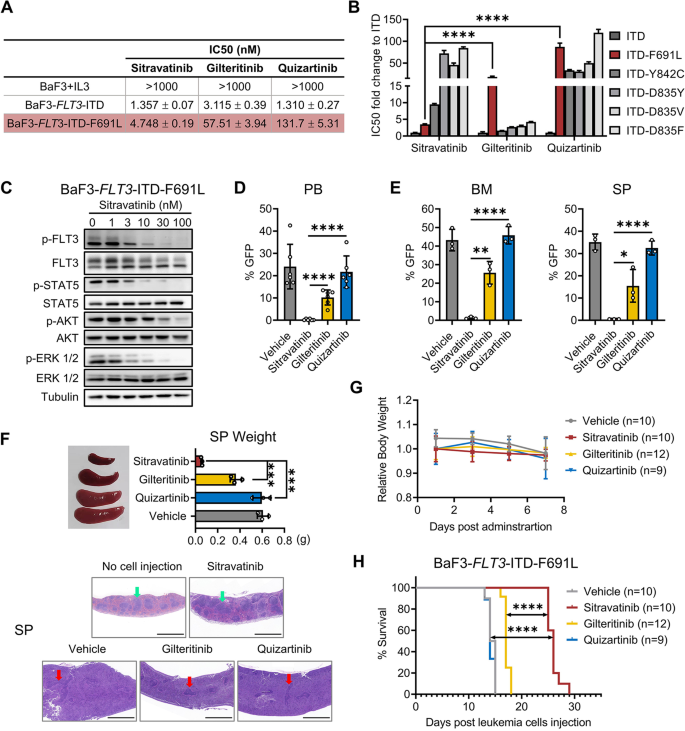 方法细节:构建BaF3-FLT3-ITD-F691L细胞系,检测西曲替尼/吉瑞替尼/奎扎替尼的IC50(增殖实验);免疫印迹检测FLT3信号通路。构建BaF3-FLT3-ITD-F691L动物模型(BALB/c小鼠,静脉注射2×10⁶细胞),分组给药10天后,检测PB/BM/SP中的GFP+细胞比例,观察脾脏大小及组织学变化(H&E染色)。