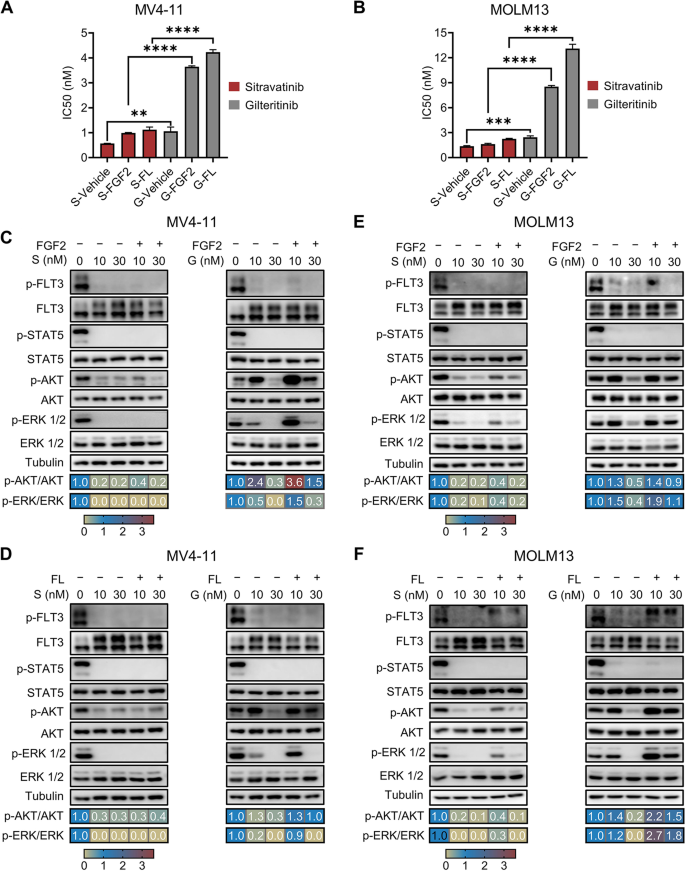 方法细节:在MV4-11/MOLM13细胞中加入FL(10 ng/mL)或FGF2(10 ng/mL),检测西曲替尼/吉瑞替尼的IC50(增殖实验);免疫印迹检测AKT/ERK磷酸化水平(3小时药物处理+3小时细胞因子处理)。