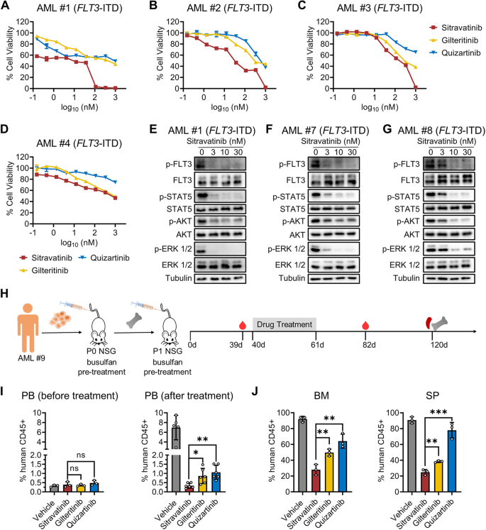 方法细节:收集8例AML患者原代细胞(6例FLT3-ITD,2例FLT3-WT),检测药物的增殖抑制作用(CellTiter-Glo法);免疫印迹检测FLT3信号通路。构建FLT3-ITD AML PDX模型(NSG小鼠,静脉注射2×10⁶患者细胞),40天后给药21天,检测PB/BM/SP中的人类CD45+细胞比例。