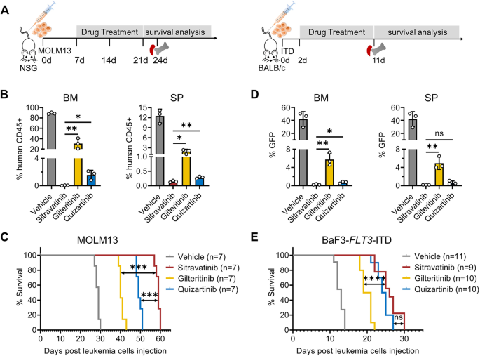 方法细节:构建MOLM13细胞异种移植模型(NSG小鼠,静脉注射5×10⁶细胞),随机分为Vehicle、西曲替尼(20 mg/kg)、吉瑞替尼(30 mg/kg)、奎扎替尼(10 mg/kg)组,每日灌胃14天。24天后检测骨髓(BM)/脾脏(SP)中人类CD45+细胞比例(流式细胞术),观察生存情况(Kaplan-Meier曲线)。同时构建BaF3-FLT3-ITD模型(BALB/c小鼠,静脉注射2×10⁶细胞),检测外周血(PB)/BM/SP中的GFP+白血病细胞比例。