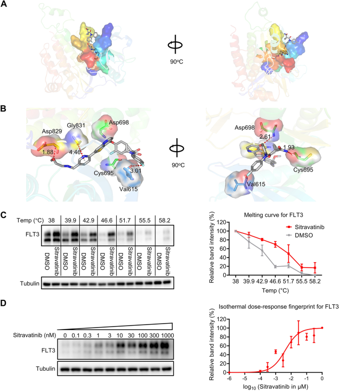 方法细节:通过分子对接(Schrödinger软件)预测西曲替尼与FLT3(PDB ID: 6JQR)的结合位点及亲和力;采用细胞热位移分析(CETSA)验证直接结合:BaF3-FLT3-ITD细胞经西曲替尼(30 μM)或DMSO处理1小时后,梯度温度(38-58.2℃)加热3分钟,免疫印迹检测可溶性FLT3水平;进一步通过等温剂量反应实验(51.7℃加热3分钟,西曲替尼浓度0-1000 nM)验证剂量依赖性。