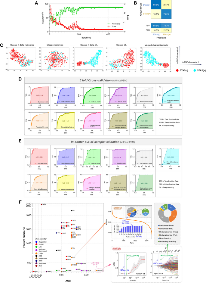 实验目的是筛选可靠特征,优化分类器,提高模型性能。方法细节:首先用ICC>0.75筛选可靠特征(共3404个,包括肿瘤和瘤周的放射组学、delta-radiomics特征),然后用45种特征选择算法(如LASSO、ReliefF)和32种分类器(如SVM、随机森林)组合(共1440种),通过五折交叉验证选择AUC最高的组合。结果解读:最优组合为LASSO回归+线性SVM,提取56个关键特征(其中22个来自delta-radiomics,5个来自delta-DL),这些特征对STAS预测贡献最大。t-SNE聚类显示,加入delta特征后,STAS阳性与阴性组的聚类更分离(图5C)。产品关联:使用Python的scikit-learn库进行特征选择和分类器训练,R软件进行LASSO回归分析。