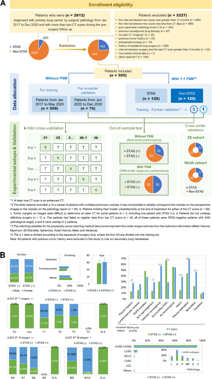 实验目的是建立多中心回顾性队列,确保数据的代表性和可靠性。方法细节:回顾性纳入2017-2020年三个中国医院(上海胸科医院、中山医院、第九人民医院)的674例原发性肺癌患者,均有术前CT随访(间隔≥2周)和术后病理诊断。上海胸科医院的509例为训练集,76例为内部验证集;中山医院36例、第九人民医院53例为外部验证集。排除标准包括随访间隔<21天或>12个月、CT参数不匹配、新辅助治疗、无平扫CT、既往肿瘤史等。对队列进行倾向评分匹配(PSM),平衡STAS阳性与阴性组的形状和一阶特征。结果解读:基线信息显示患者年龄(中位数60岁)、性别(女性占61.4%)、病理亚型(以腺泡型、乳头状、贴壁型为主)与现有研究一致,STAS阳性率24.4%(143/585),PSM后队列平衡,减少选择偏倚。产品关联:文献未提及具体实验产品,领域常规使用医院电子病历系统(如HIS)提取临床信息,病理信息系统(如LIS)获取STAS诊断,统计软件(如SPSS、R)进行基线分析。