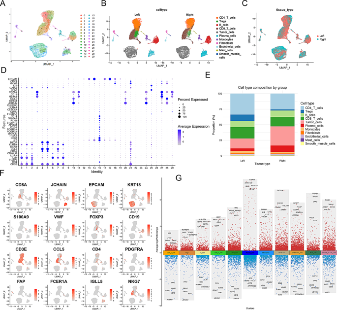 方法细节:收集8例左侧、8例右侧结直肠癌患者的新鲜组织样本,进行单细胞RNA测序(scRNA-seq);用Seurat包进行质控(过滤基因数200-4000、线粒体基因比例<10%的细胞)、归一化及聚类,基于marker基因(肿瘤细胞:KRT8/KRT18;成纤维细胞:COL1A1/COL3A1;Treg:IL7R/FYB1)注释11种细胞亚群。