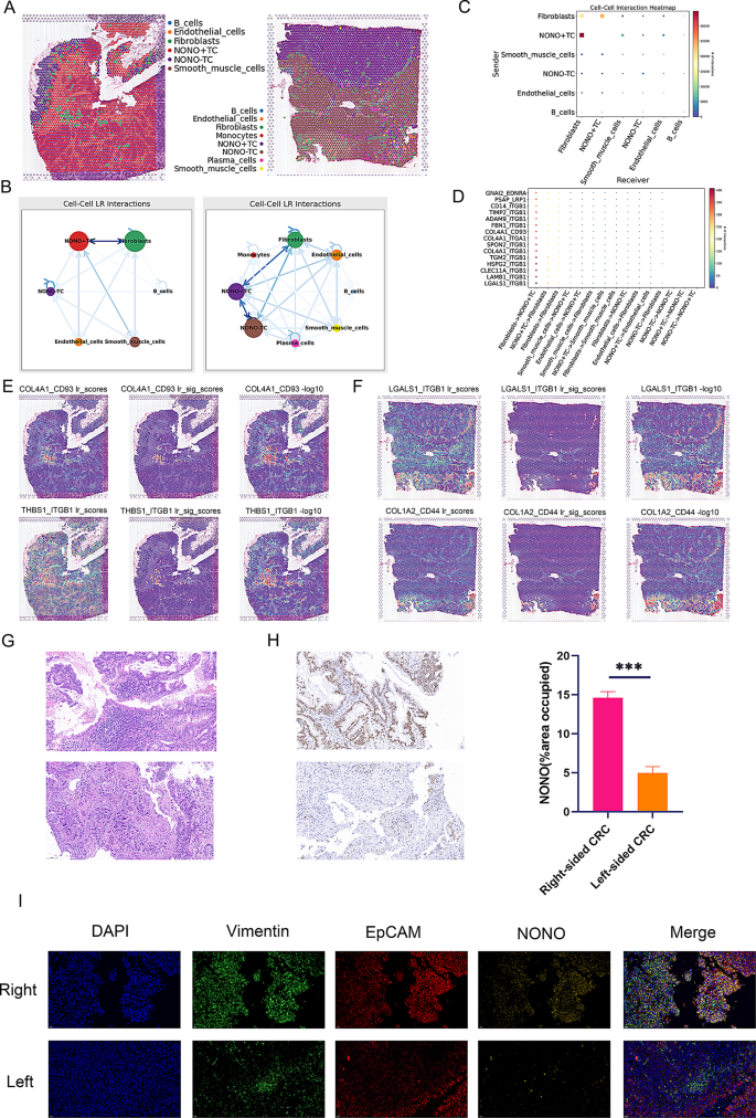 方法细节:收集4例右侧结直肠癌患者的空间转录组样本,用RCTD进行细胞类型反卷积;结合HE染色和空间聚类结果,分析NONO⁺ TC与成纤维细胞的空间分布;用mistyR进行多尺度空间相互作用分析。