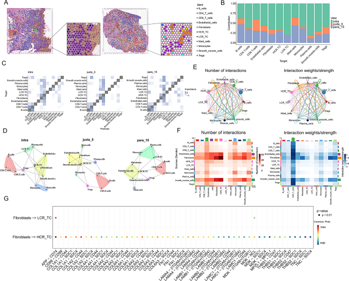结果解读:NONO⁺ TC主要分布在肿瘤巢,而成纤维细胞富集在NONO⁺ TC簇的边界,形成直接细胞界面;空间相互作用分析显示,成纤维细胞对NONO⁺ TC的重要性评分在intra(55.21)、juxta(40.04)层均显著高于其他细胞类型(均p<0.001)(图3、图5)。